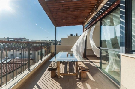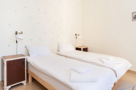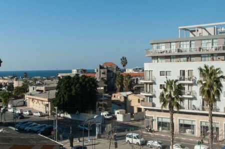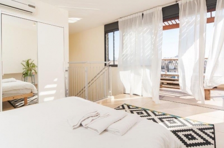 This 2 story penthouse is beautifully decorated with taste and is fully equipped to the last detail. You will enjoy the luxury of central heating and air, new furniture and appliances, a fully equipped kitchen, WIFI, cable television and 3 luxurious bedrooms. On the main floor you will find a fully equipped kitchen and dining room set for 4 people and living room area with a television and a comfortable sofa. There are also 2 bedrooms, one with a queen size bed and the other with two twin beds that can be left separate or put together to make a full size bed, and a fully equipped bathroom including a washer and dryer. Upstairs you will find the master bedroom and bathroom with an open air feel, a full wall of sliding glass doors that lead to a large 20 meter patio with an outdoor table perfect for a group of friends or a family meal overlooking Jaffa and a smaller window with a beautiful view of the sea. This bedroom has a private bathroom and a separate heating and air conditioning unit. Very stylish 2 Bedrooms in one of the most renowned centers of Jaffa , full of shops and excellent restaurants. |