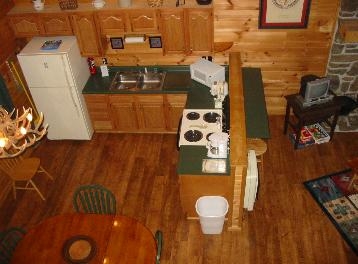 The Cabin has one bedroom with a private bath and a loft that can sleep 4 overlooking the great room. The great room has a futon that converts to a full bed. There is an additional full bath downstairs. There is a fully equipped kitchen. Towels and linens are furnished, and for your convenience there is a washer and dryer. Outside is a porch swing to kick back and enjoy mother nature. We also provide an outdoor gas grill for your enjoyment. |