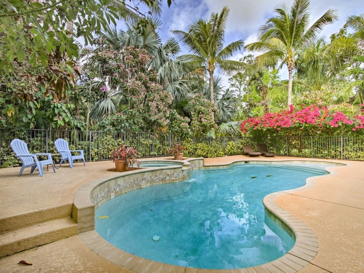Vacation like a king! This Mediterranean villa is situated on a large 1.2 acres tucked away in a dead end street at the Jupiter farms with lush tropical landscaping. The outdoor back yard features a waterfall-style pool, jacuzzi, covered lanai, and barbecue. Completely newly furnished it offers a king master bedroom suite with a beautiful master bath, 4 extra large bedrooms with 3 queen bedroom furnished sets and 1 full bedroom sets and 2 additional full baths. Large formal living room with full pullout couch set brings the total sleeping accommodations to 12 people. Large kitchen with stainless steel appliances, granite counters cherry cabinets completely equipped with full appliances and all utensils and chinaware, ready for your enjoyment. Fully stocked with all linens for your use. Large family room with 2 37 inch flat screens. Large Washer/dryer available for your use. Three car garages available as well as additional boat/RV garage with its own driveway!
